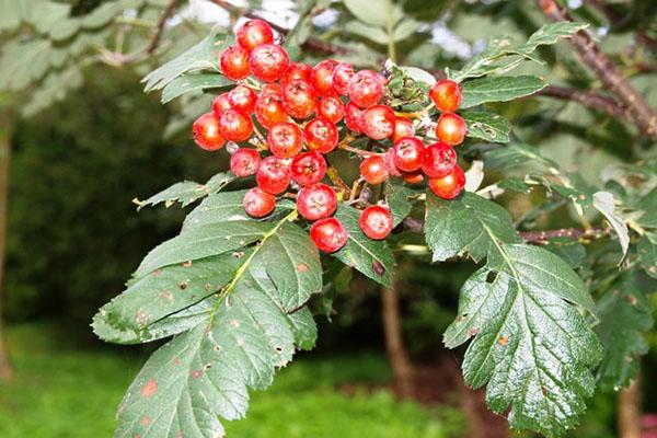 Этот вид рябины принадлежит к семейству Розоцветных. Дерево отличается пирамидальной кроной, которая со временем приобретает округлую форму. Листья у него сложные и многосоставные: у основания они глубоко рассечены, а ближе к верхушке имеют менее выраженные разрезы, напоминая по форме дубовые листья. В мае рябина начинает цвести, покрываясь белыми многоцветковыми кистями. С середины сентября на дереве появляются ярко-красные ягоды, которые остаются на ветках до зимы.